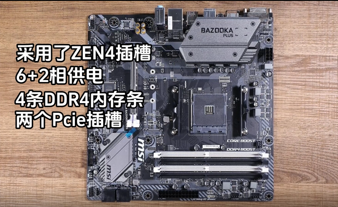 采用了ZEN4插槽,6+2相供电,4条DDR4内存插槽,2个pcie插槽,其中一个有金属加固,,支4个sata3.0 IO接口比较丰富,一件重置BIOS按钮,ps2鼠标/键盘接口,DP/HDMI视频输出接口.2个usb2.0.6个usb3.0 支持无CPU更新bios功能.,1个千兆网口,一组音频接口。